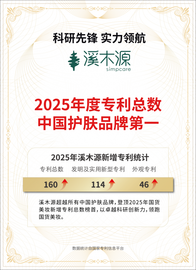 数据显示,截至2026年1月底,溪木源累计专利授权及申请471项,且2025年新增专利总数达160项,位居中国护肤品牌首位。自品牌创立以来,累计完成超过1.8万人次的人体功效测试及近1200项人体临床验证,全面保障产品在安全性、功效性及使用肤感上的综合表现。