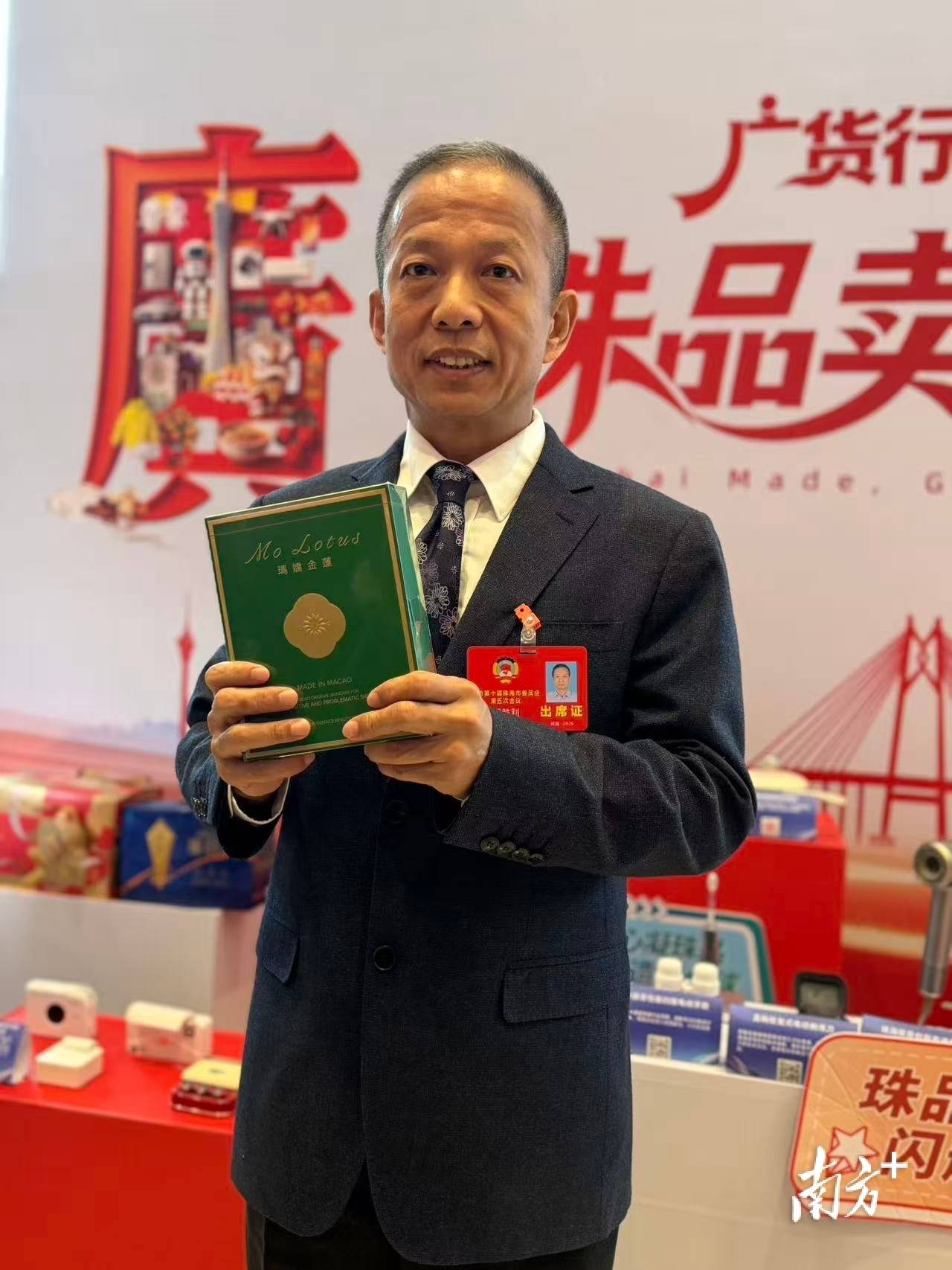 珠海市政协委员王德友与翟胜利都带来了本土美妆产品。王德友所在的珠海市伊斯佳科技股份有限公司,专门从事化妆品的研发生产和营销,主要为美妆大品牌提供研发、生产和加工服务。