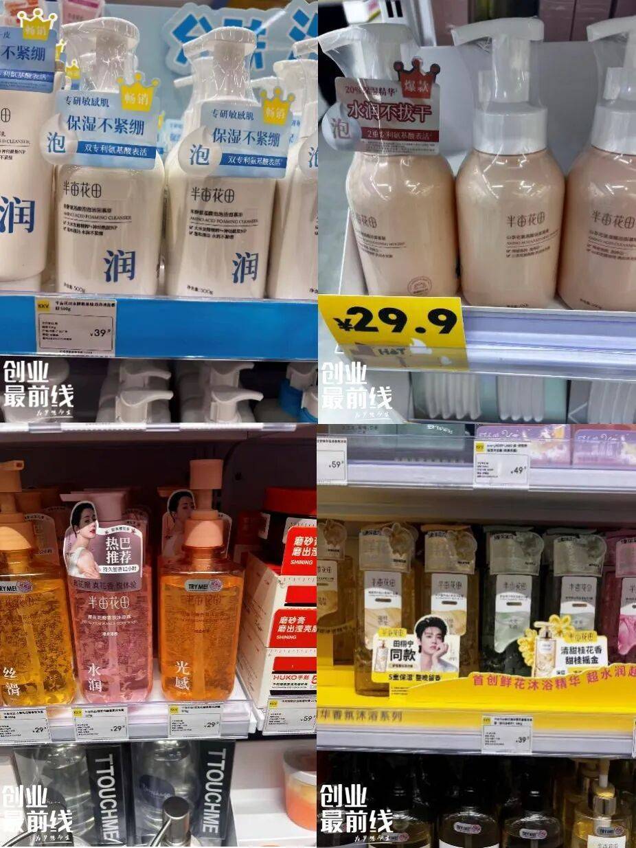 近日,在美妆集合店KKV北京的一家门店,「创业最前线」记者看到,货架上摆放的半亩花田氨基酸洁面产品,不仅容量大,普遍为350g、500g,售价则是29.9元、39.9元不等。而沐浴露产品,同样也是在29.9元——39.9元价格带居多。
