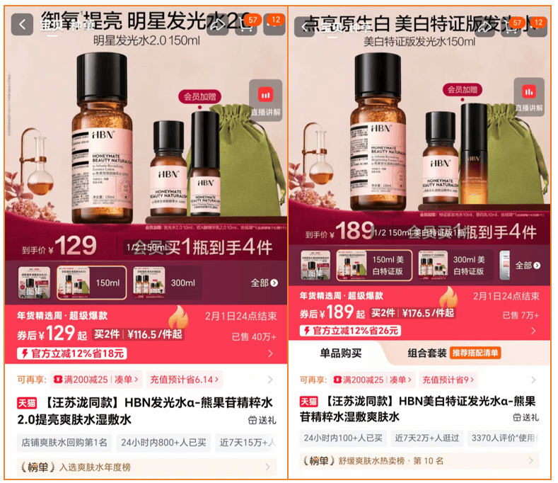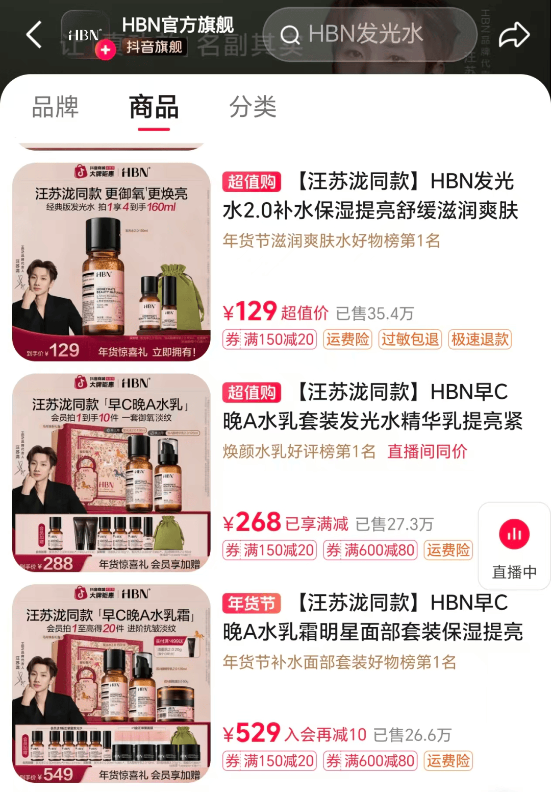 HBN在淘宝渠道以功效型精华水、A醇抗老系列为核心发力点,精准契合货架电商用户主动搜索功效性产品的消费习惯。